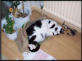 Oh and why has Robinson decided that my hessian long-life bag is just the place he wants to be so that I cannot clear up? It is decorated with ladybirds which he has attempted to catch and is just the place to lie in the hall which I find puzzling.  There are many of these bags in the house which are left in the hall awaiting transfer to the car where they normally live and it is just this particular bag which has apparently an enormous attraction for a very silly cat.