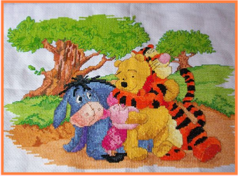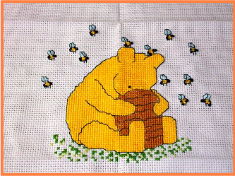 I have been finishing up some projects in the handicraft line and am delighted to say that a very difficult cross-stitch which was foisted on me is now completely finished and with the framers for the finishing touches.  It was not something which I would have undertaken voluntarily but my friend's daughter bought it thinking she would complete it in no time, took one look at it and decided that she would ask her mum to ask me to take it on.  It was a lot of work but it will be ready in time for Ben's second birthday in October.  Of course, I could not overlook the fact that Ben now has a baby sister so I have done a smaller, Pooh Bear for her which I enjoyed.